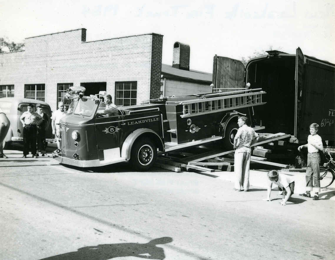 14- New Draper Fire Truck is unloaded from the train in Leaksville in 1961. Pictured are Earl Pruitt, Bud Lewis, Jim Bailey, Eph Harmon, and Dickie Powell.